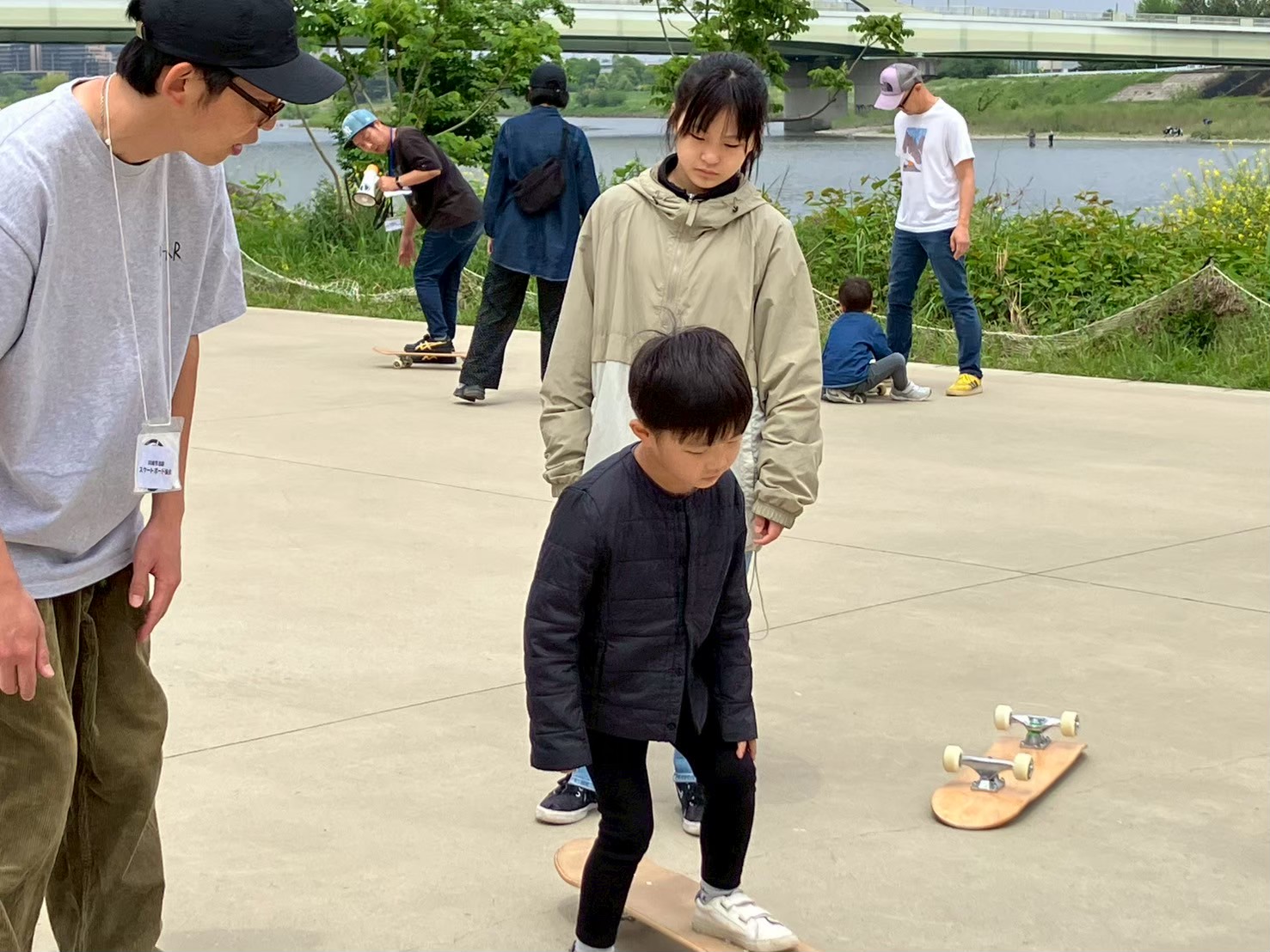 安全性に最大限配慮しながら、スケートボードの基本動作を丁寧に指導しました。登戸たまがわマルシェという地域の大きなイベントの中での開催ということで、各回とも先着10組程度の定員でしたが、全ての回で定員を超える申し込みをいただき、スケートボードへの関心の高さを実証しました。